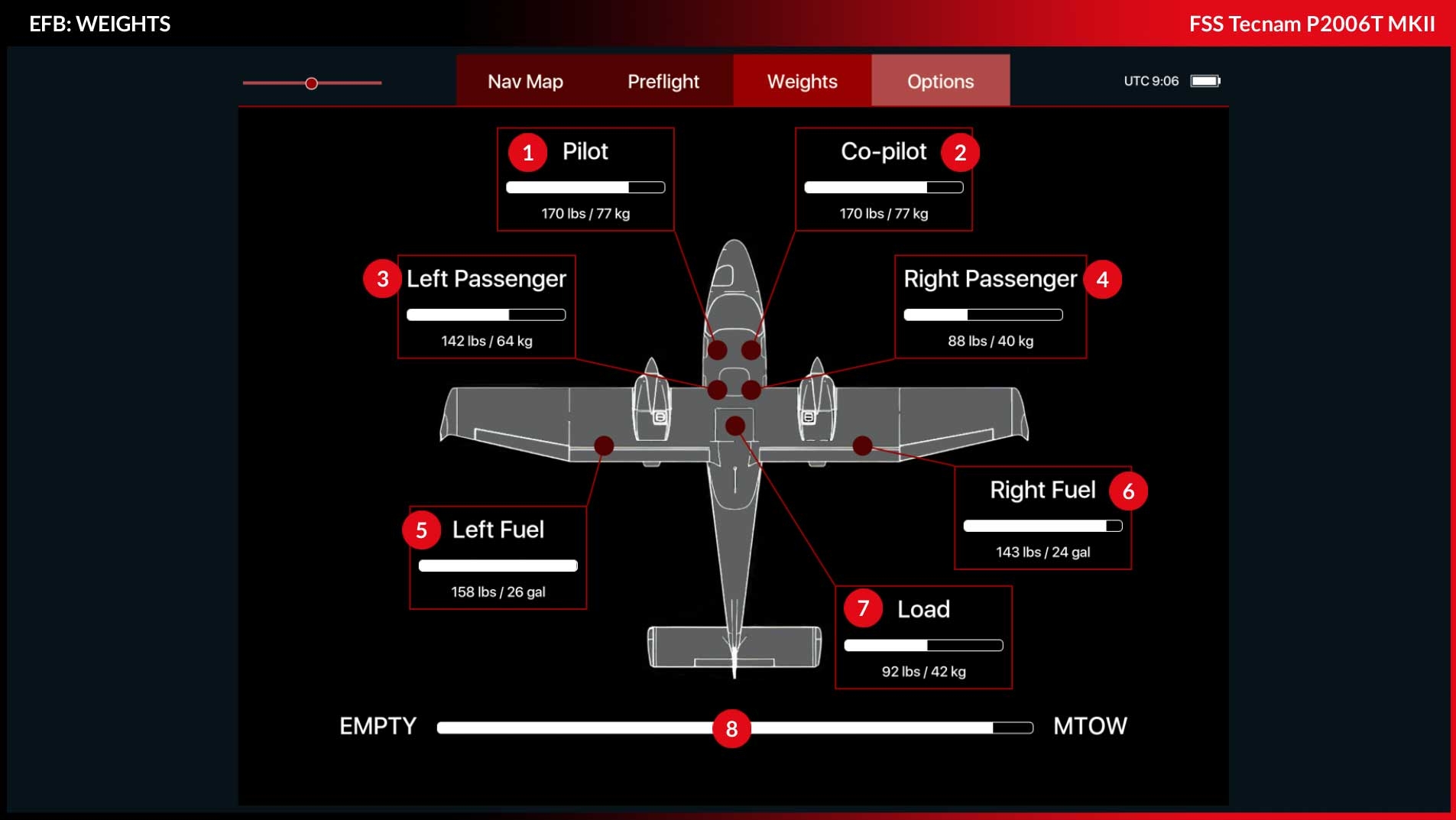 The aircraft weight can be set via the default MSFS Weight & Balance menu or via the EFB integrated in the Tecnam.